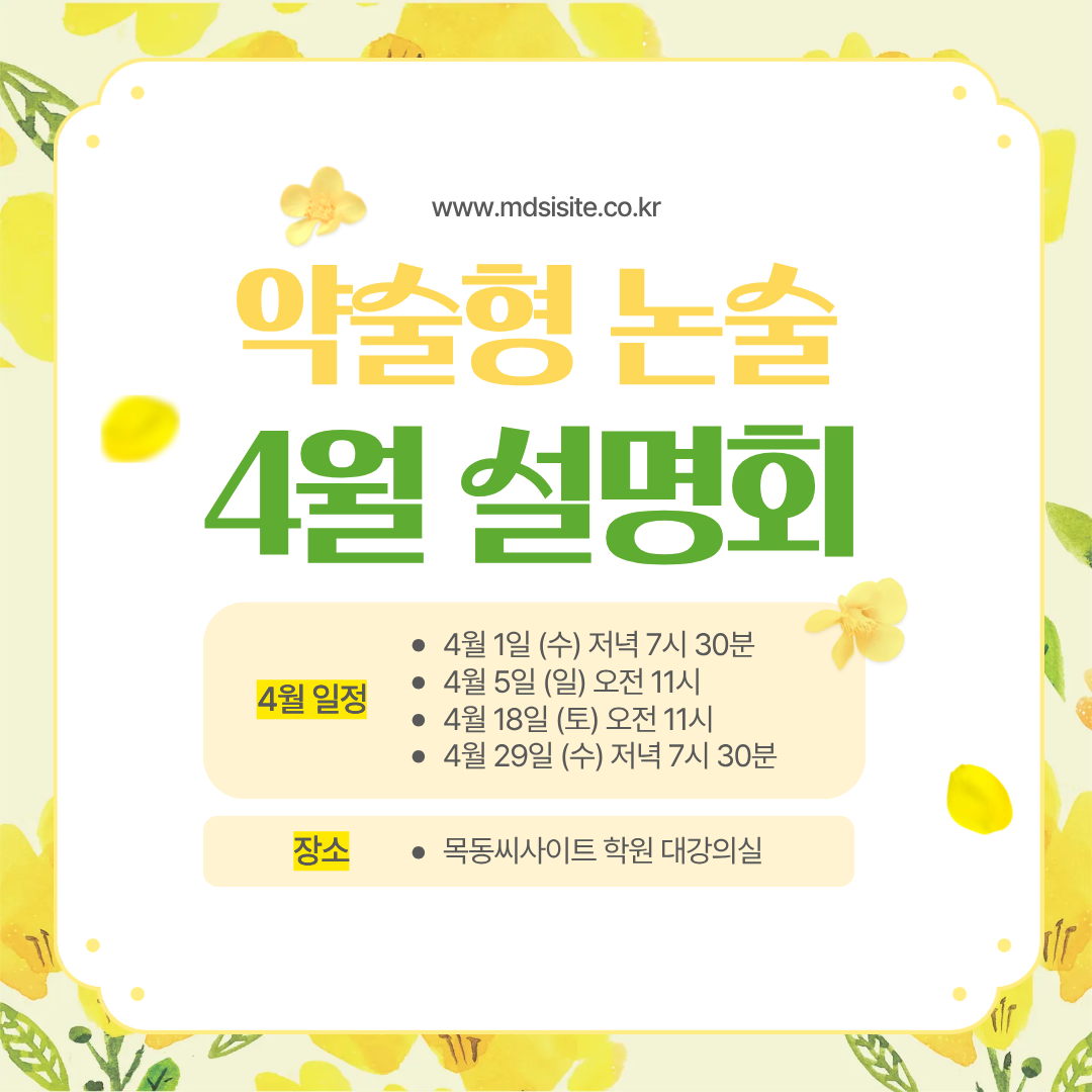 입시는 정보 싸움이 아니라 전략 싸움입니다. 특히 약술형 논술 전형은 준비 시기와 방향 설정에 따라 결과가 크게 달라지는 전형입니다. 같은 성적 대에서도 누군가는 합격하고, 누군가는 탈락하는 이유는 정보와 전략의 차이에서 비롯됩니다. 4월은 아직 충분한 시간과 가능성이 남아 있는 시기이며, 이 시기에 올바른 방향을 설정한 학생과 그렇지 않은 학생의 격차는 시간이 지날수록 더욱 벌어집니다.