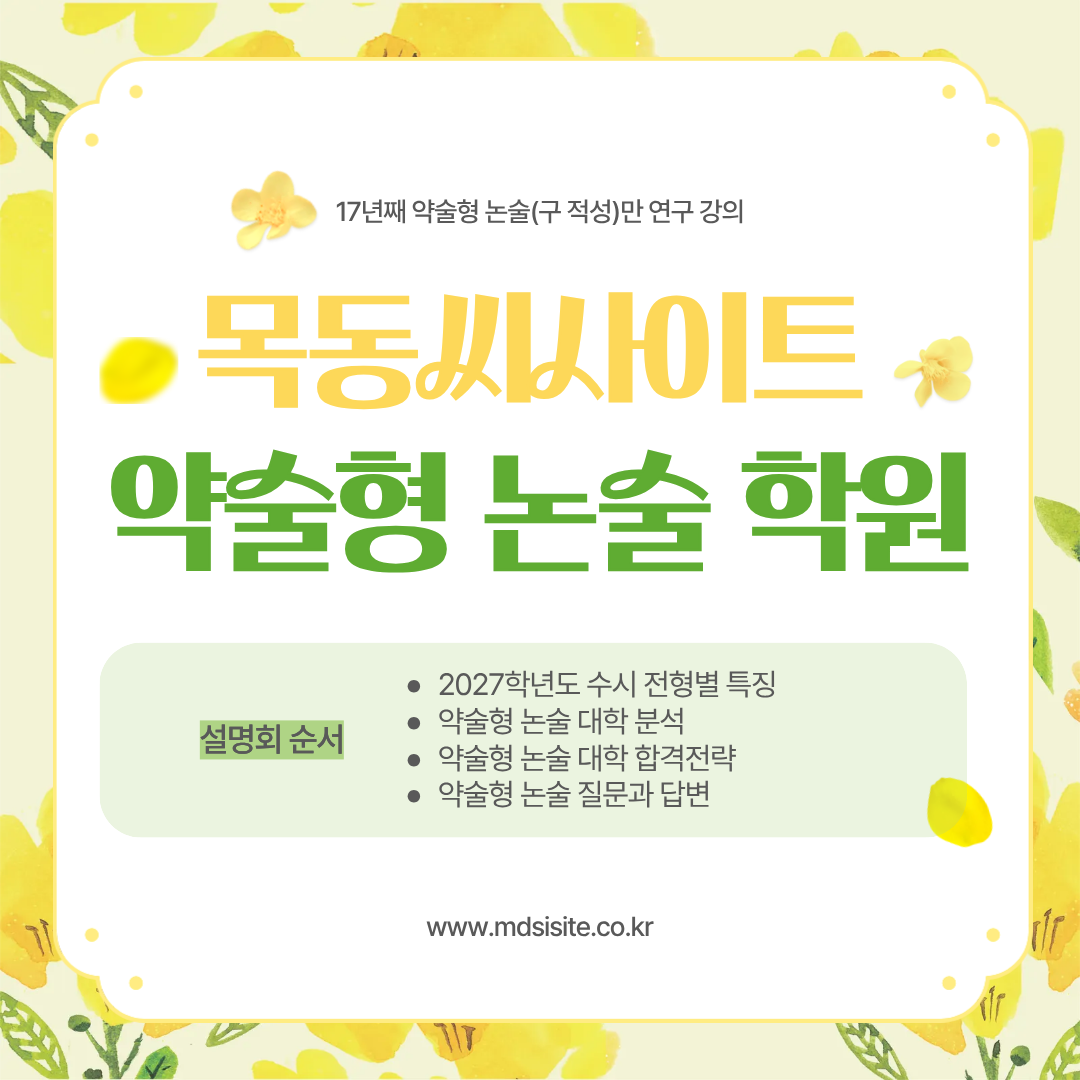 이에 따라 목동씨사이트학원에서는 고3 및 N수생을 대상으로 2027학년도 대비 약술형 논술 4월 설명회를 개최하여, 수험생과 학부모님들께 정확한 정보와 현실적인 전략을 제공하고자 합니다. 본 설명회는 단순히 전형 정보를 나열하는 자리가 아니라, 학생 개개인의 상황을 기준으로 어떤 방향이 가장 합리적인지 판단할 수 있도록 돕는 실질적인 설명회입니다.